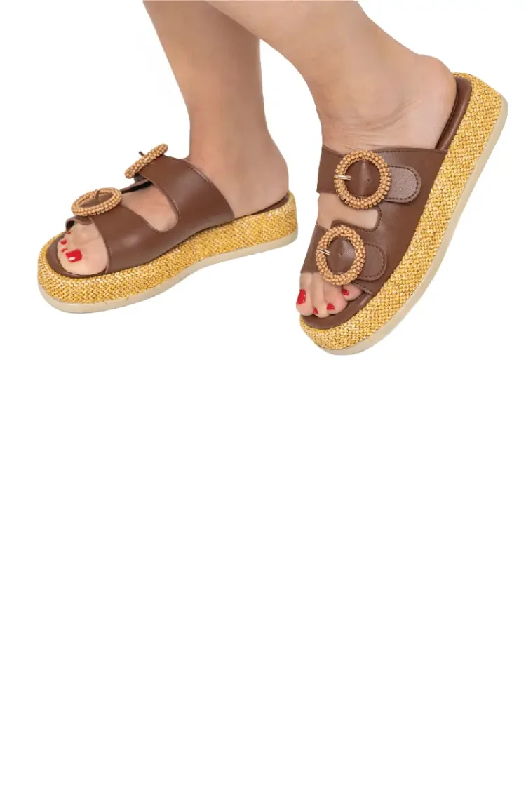 Ιταλική παντόφλα με δερμάτινο πέλμα και διακοσμητικές αγκράφες. Οι αγκράφες βοηθούν στη στην αυξομείωση ώστε να ανοίγει όταν τα πόδια πρήζονται λόγω του καλοκαιριού.